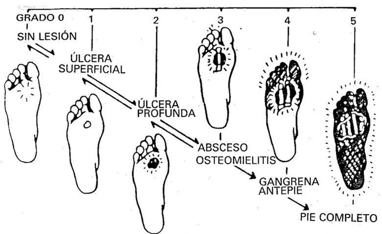 Para unificar los criterios de tratamiento y descripción se elaboró en el año 1970 una teoría sobre las lesiones del pie diabético que terminó en una clasificación de 5 grados de complejidad. Este tipo clasificación se conoce con el apellido de uno de los médicos que participó en su creación, el Dr. Wagner.